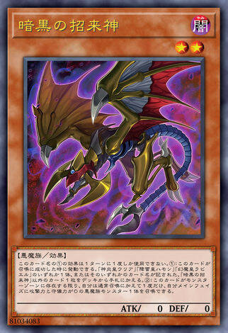 效果:这个卡名的①的效果1回合只能使用1次。 ①:这张卡召唤成功时才能发动。把「神炎皇 乌利亚」「降雷皇 哈蒙」「幻魔皇 拉比艾尔」的其中1只或者有那其中任意种的卡名记述的1张「暗黑之招来神」以外的卡从卡组加入手卡。 ②:只要这张卡在怪兽区域存在,自己在通常召唤外加上只有1次,自己主要阶段可以把1只攻击力和守备力是0的恶魔族怪兽召唤。