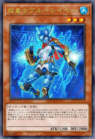 效果:「超级量子战士 蓝光层」的①②的效果1回合各能使用1次。 ①:这张卡召唤·特殊召唤成功时才能发动。从卡组把「超级量子战士 蓝光层」以外的1张「超级量子」卡加入手卡。 ②:这张卡被送去墓地的场合,以自己墓地最多3张「超级量子」卡为对象才能发动。那些卡回到卡组。