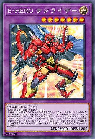 时隔40个卡盒,横跨3年零4个月,英雄再次归来,成为新卡盒的封面!而且这次的日升侠的绝绝对对的英雄大腿终端之一。召唤条件简单,进场检索【奇迹结合】,攻击力buff一般都能提升400点,而且以英雄卡组的特招能力,加满600点问题也不大。③效果是一个解场效果,但是仅限于自己以外的英雄怪兽攻宣才能发动。