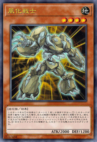 效果:这个卡名的①的效果1回合只能使用1次。 ①:这张卡被效果送去墓地的场合或者被战斗破坏的场合才能发动。把「风化战士」以外的1张有「化石融合」的卡名记述的卡或者「化石融合」从卡组加入手卡。 ②:自己结束阶段发动。这张卡的攻击力下降600。