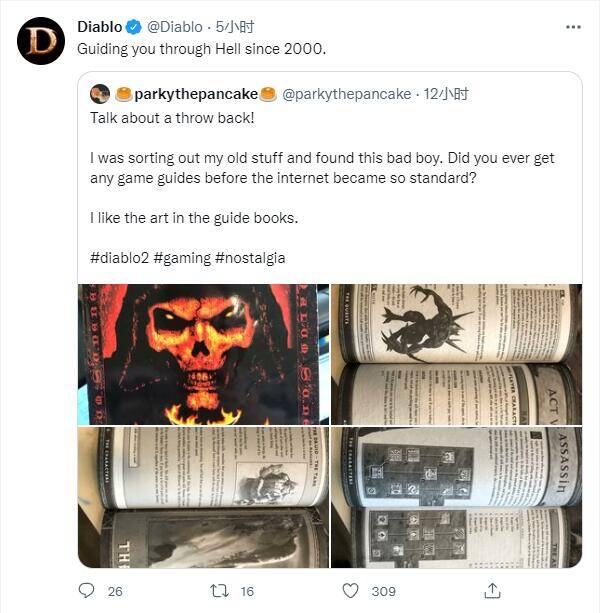 时值《暗黑破坏神2》发售22周年,有国外老玩家晒出了自己珍藏多年的《暗黑破坏神2》攻略书,官方推特对此进行了转发,并发布了动态:Guiding you through Hell since 2000 。