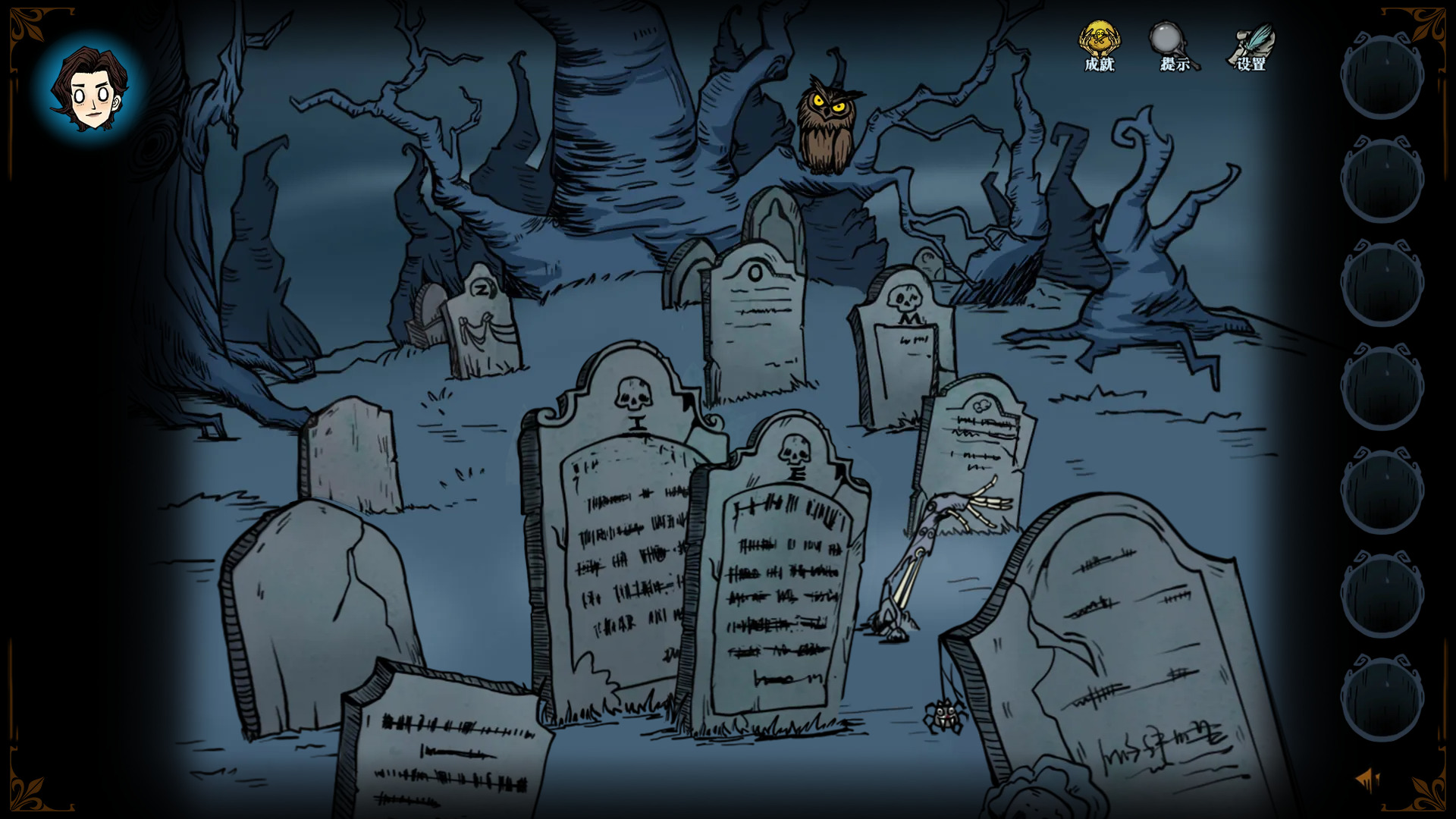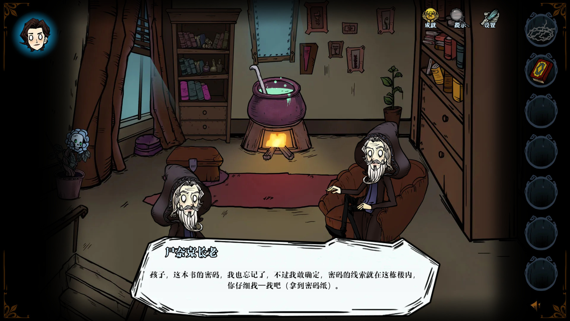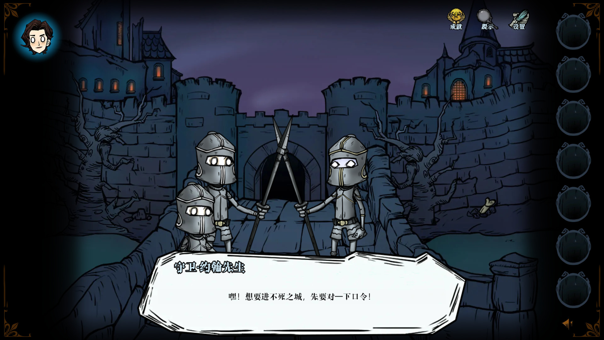 不过本作剧情上缺乏提示,可能推进时会犯难,但是总体难题解谜的难度适中,是可以接受的。比如一开始进城需要输入口令,守卫会跟你说回之前的地方看看吧,然后我们就能看到初始地方的墓碑上有五个字母,按顺序输入即可。