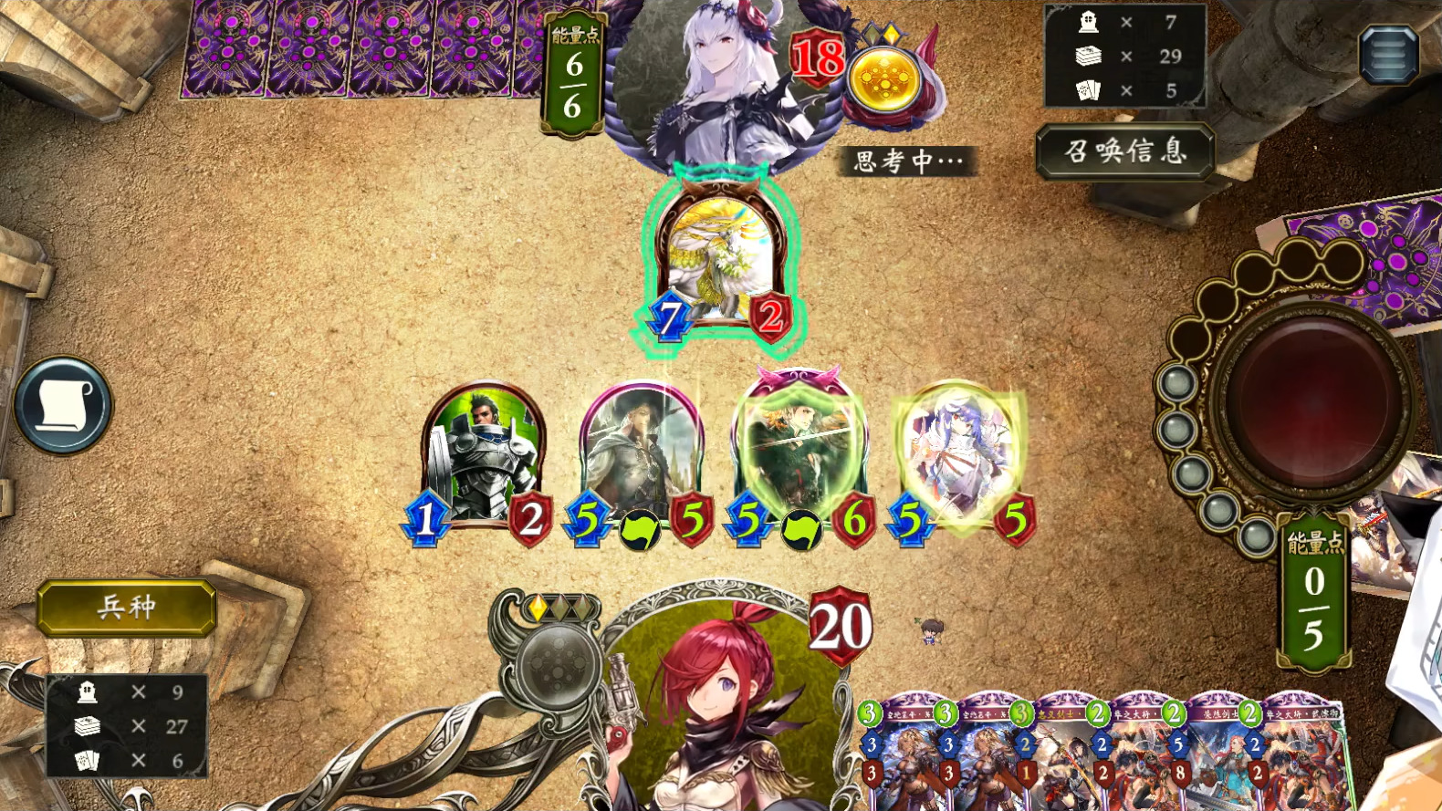 【中后期】预计对手可能动作,根据预判和当前局势选择争夺场面、抢血或积攒伤害。留意是否会被卡场,尽量规避。如果准备依靠荣胜站场取胜,需要通过瞬召士兵长配合他。为此需要堆够协作数,并在牌堆中士兵长不足的情况下刻意满场使瞬召不触发。