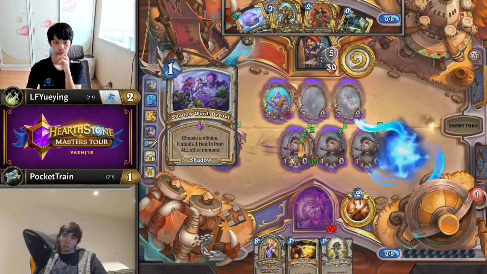 PocketTrain是竞技炉石近年来的又一颗耀眼新星,操作、构筑才华兼备,很快就已成为卡组搬运工眼里的熟面孔,今年更是被外服社区尊为野猪牧第一人。在比赛场上,他也已经是外服知名练牌团体MTOG的核心成员、Furyhunter的黄金搭档,从去年下半年起他自己也开始崭露头角,这次是他第二次晋级巡回赛淘汰赛。