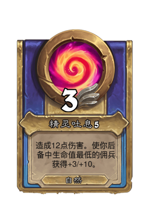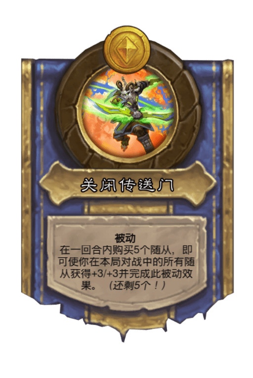 155409:被动 在一回合内购买5个随从,即可使你在本局对战中的所有随从获得+3/+3并完成此被动效果。(还剩5个!)