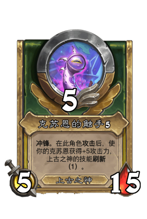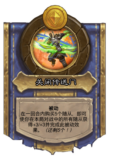 158725:被动 在一回合内购买5个随从,即可使你在本局对战中的所有随从获得+2/+2并完成此被动效果。(还剩5个!)