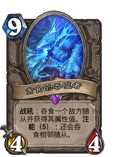 战吼:吞食一个敌方随从并获得其属性值。注能(5):还会吞食相邻随从。