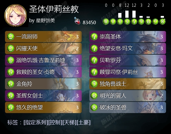 圣体的加入还有效提升了伊莉丝教对OTK的抗性。搭配能提升血量上限的一流厨师,以及能抵挡直伤的圣辉,这套牌能对组合技取得不错的胜率。这套牌还投入了闪耀天使,以便在面对天敌究极巴哈姆特时获得挣扎的余地。
