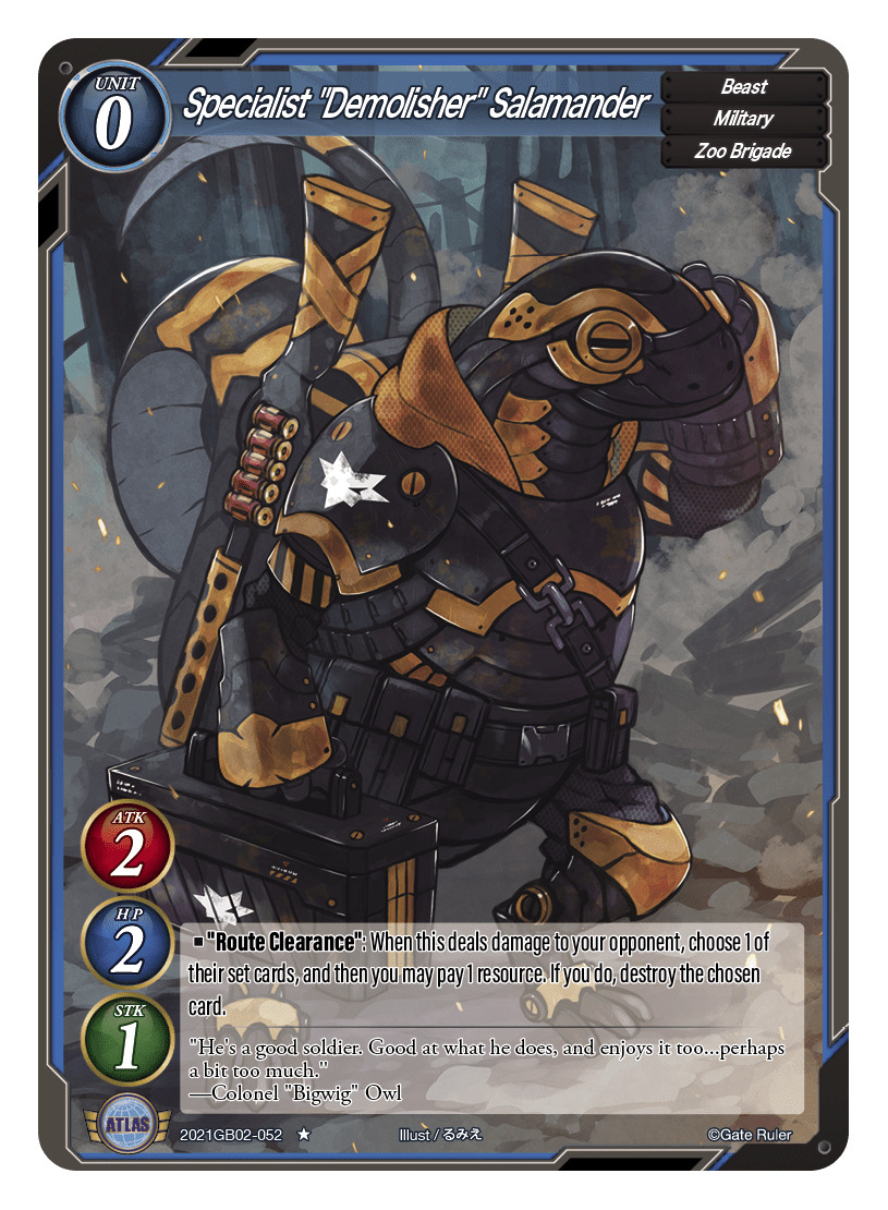 “路线清除”当此单位对对手造成伤害时,选择其配置的张牌,然后你可以支付1种资源,破坏该牌