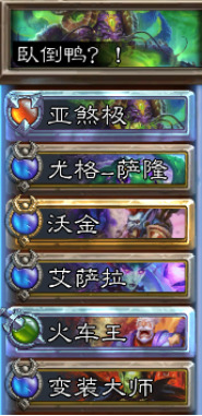 这套卡组碾压奥术,称之为“奥术**”(上限0穿6),开局乱速蛇加沃金推蛇,导致对方蛇完全废掉,如果有瓦则瓦无法进入潜行,而奈法撞在亚煞极身上也是不疼不痒。第二回合开始沃金先把蛇秒掉,导演回血亚煞极,第三回合对方补位牛,因为这回合奈法必死,所以一定不能让牛踩出来,看对方血量和速度决定导演是驱动自己还是乱速牛。第四回合亚煞极一脚把泰兰德踹死便可宣布游戏结束。其它奇怪卡组一律碾压。