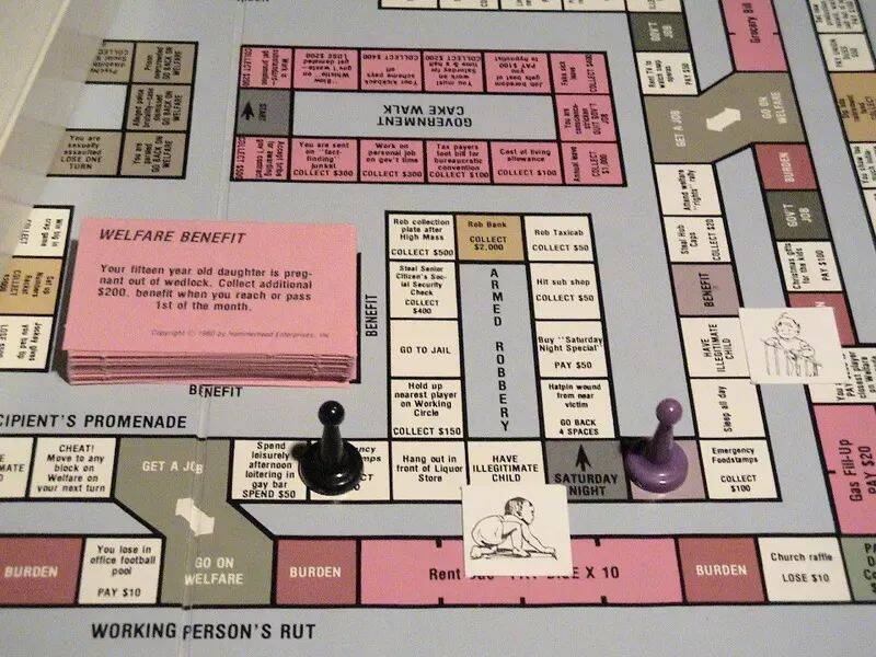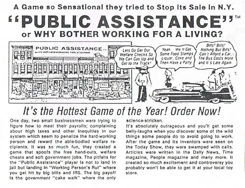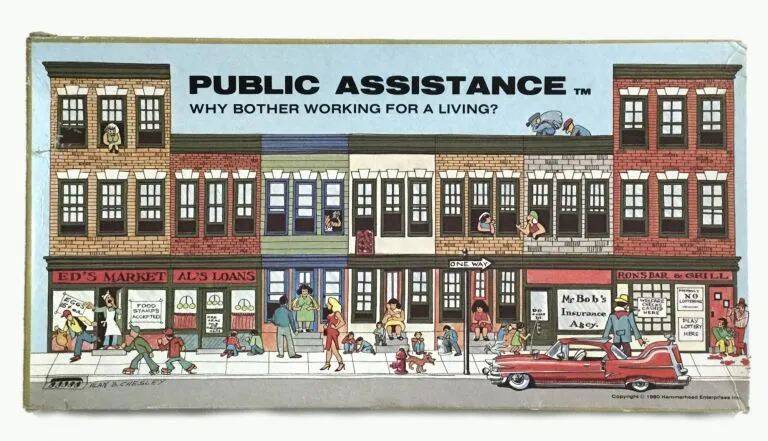 你是否遇到过以”政治不正确”为目的出品的桌游?在1980年出品《Public Assistance》并不是像我们所熟知的模拟经营游戏或是大富翁那样的运营游戏,他的游戏主旨在于"不工作,才是硬道理"嘲讽了当时美国的社会福利制度,将当时社会体系完整的展现在桌面上。