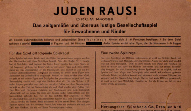 但不同时代下的桌游,渗透着当时的文明,在二战时期染着血的"德式"桌游出在德国人的家中。1938年在纳粹独裁的年代由Rudolf Fabricius,Neusalza-Sprenberg设计历史上最臭名昭著的《Juden Raus!》,整个游戏话题所体现出纯粹的种族仇恨主义。