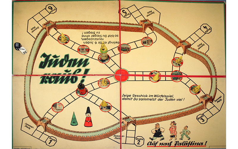 在版面所展示的是一个围城,玩家通过围捕犹太人并将其驱逐出城,第一个驱逐六个"犹太人"的玩家将获得胜利,而且其中标语写着"Auf nach Palästina!"(去巴基斯坦去!)。在桌游的宣传材料中,将游戏被描述为“适合全家人游玩的欢乐派对游戏。”,直接反映了纳粹统治时期的理念。