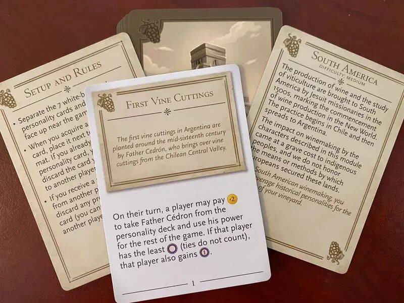 在桌游设计过程中,设计师Mihir和Francesco为了能让玩家更加能够在游戏中真实的体验到在南美的酿造之旅,加入了那些在南美引入葡萄酒与酿造方面发挥了重要作用的历史人物。说起来作为游戏内容都很合理,但这些人身上带着的历史问题就显现了出来,他们中存在着殖民者。