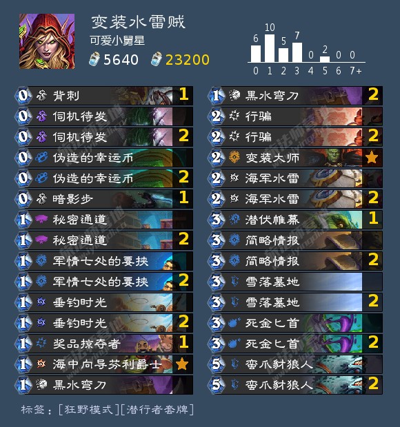 1.构筑思路。本套构筑是芬利暗影步奖品体系,定位为偏向打节奏的组合技卡组,主动出击、操作感较强,与闪避、斗篷等苟活组件思路相悖。经过我与许多好友的实践证明(其中两人从4500打到500),变装体系除非在全是内战的环境中,否则完全不需要苟活牌,豺狼人奖品暗影步的控场能力完全够用,苟活牌只会卡到自己的节奏。