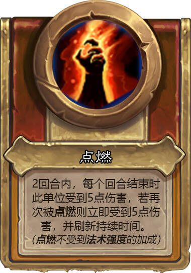 相当于一个固定5伤害的2回合流血,已经被点燃的单位再次被点燃会立刻受到5伤害,然后刷新持续时间。
