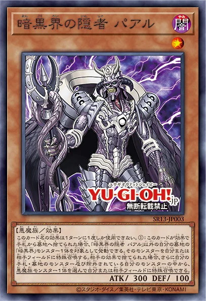 ①:这张卡被效果从手卡丢弃去墓地的场合,以「暗黒界の隠者 パアル」以外的自己墓地的1只「暗黑界」怪兽为对象才能发动。那只怪兽在自己或者对方场上特殊召唤。被对方的效果丢弃的场合,可以再从自己手卡·墓地的怪兽以及被除外的自己怪兽之中选1只恶魔族怪兽在自己或者对方场上特殊召唤。