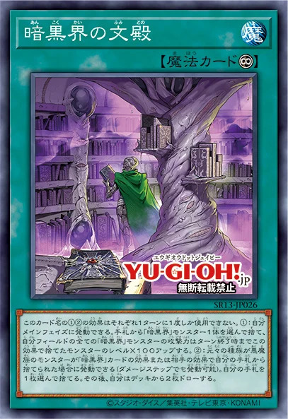 ①:把这张卡从手卡丢弃去墓地才能发动。从卡组把1张「暗黑界之门」加入手卡。