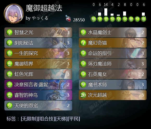 前期尽快过牌,适当使用虹色光辉等组件,干扰对手运作。尽快为次元超越,以及环刃魔法师、命运的指引等关键牌刷增幅,以便尽快使用0费增幅组件。中期规划费用,优先采取能触发水晶魔剑士额外效果的打法,并计算能否使用超越,以及伤害是否足够。