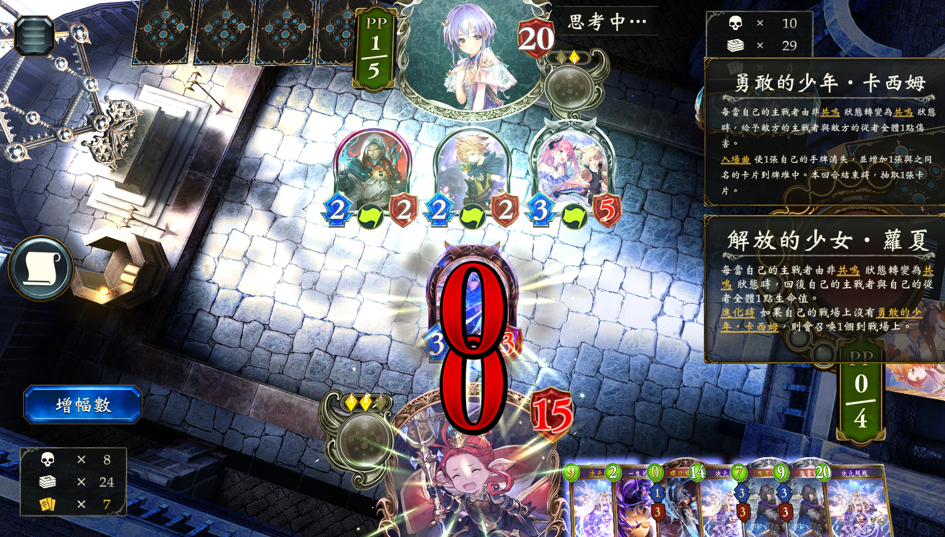【第4回合】先手积极使用被减至0~1费的增幅牌,但可保留环刃,用于在下回合进化。其余参考第3回合动作。