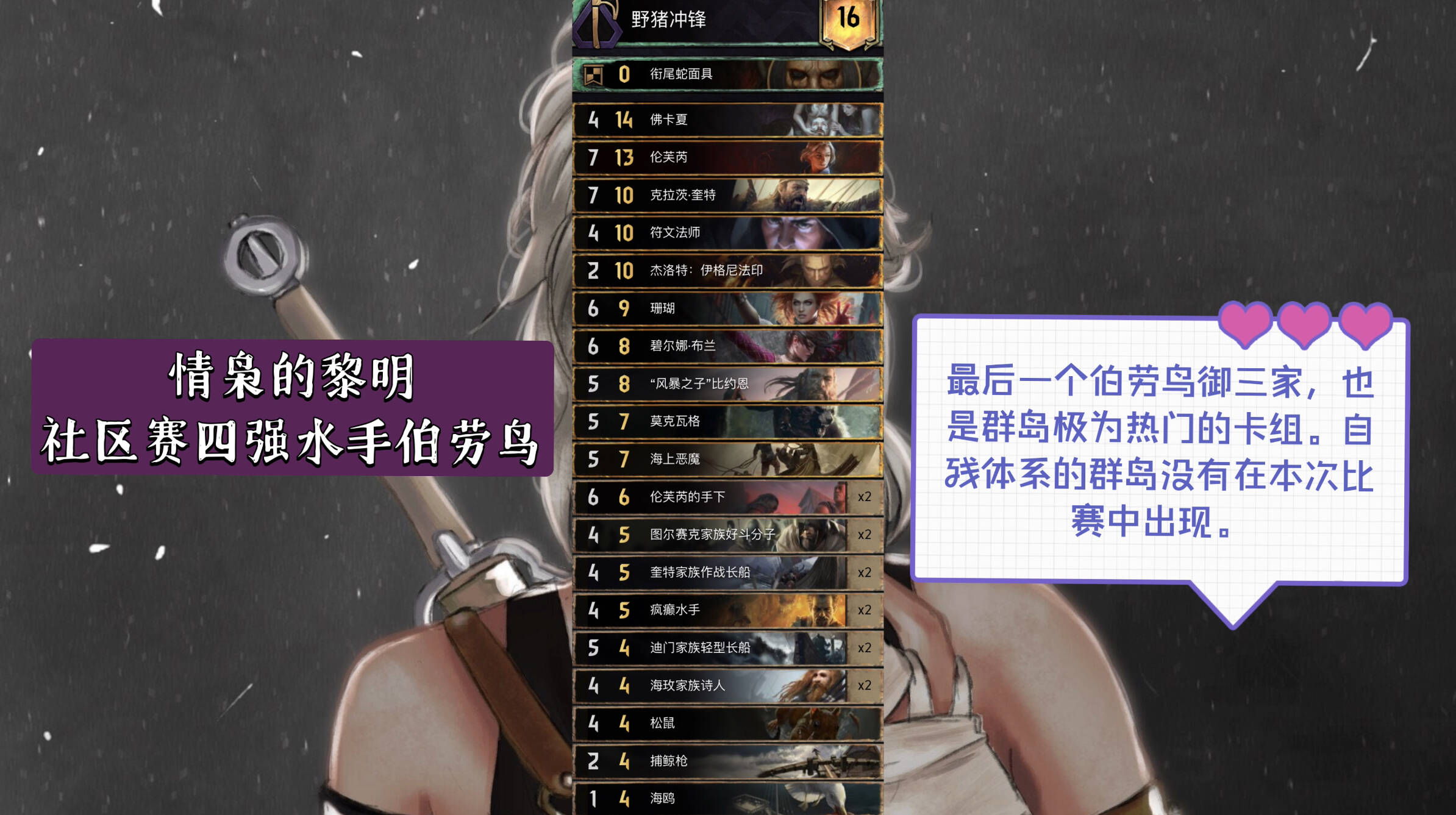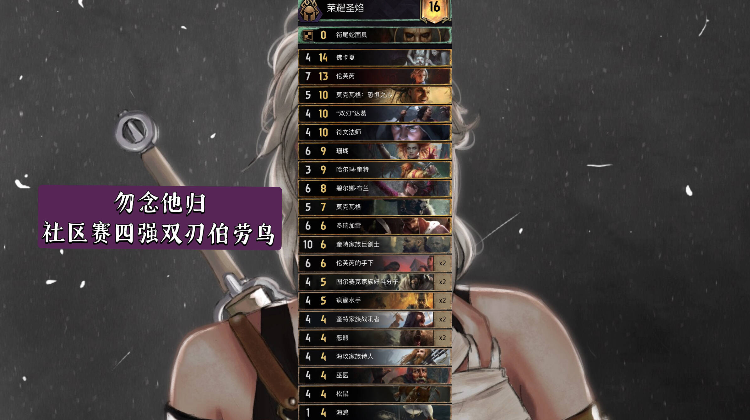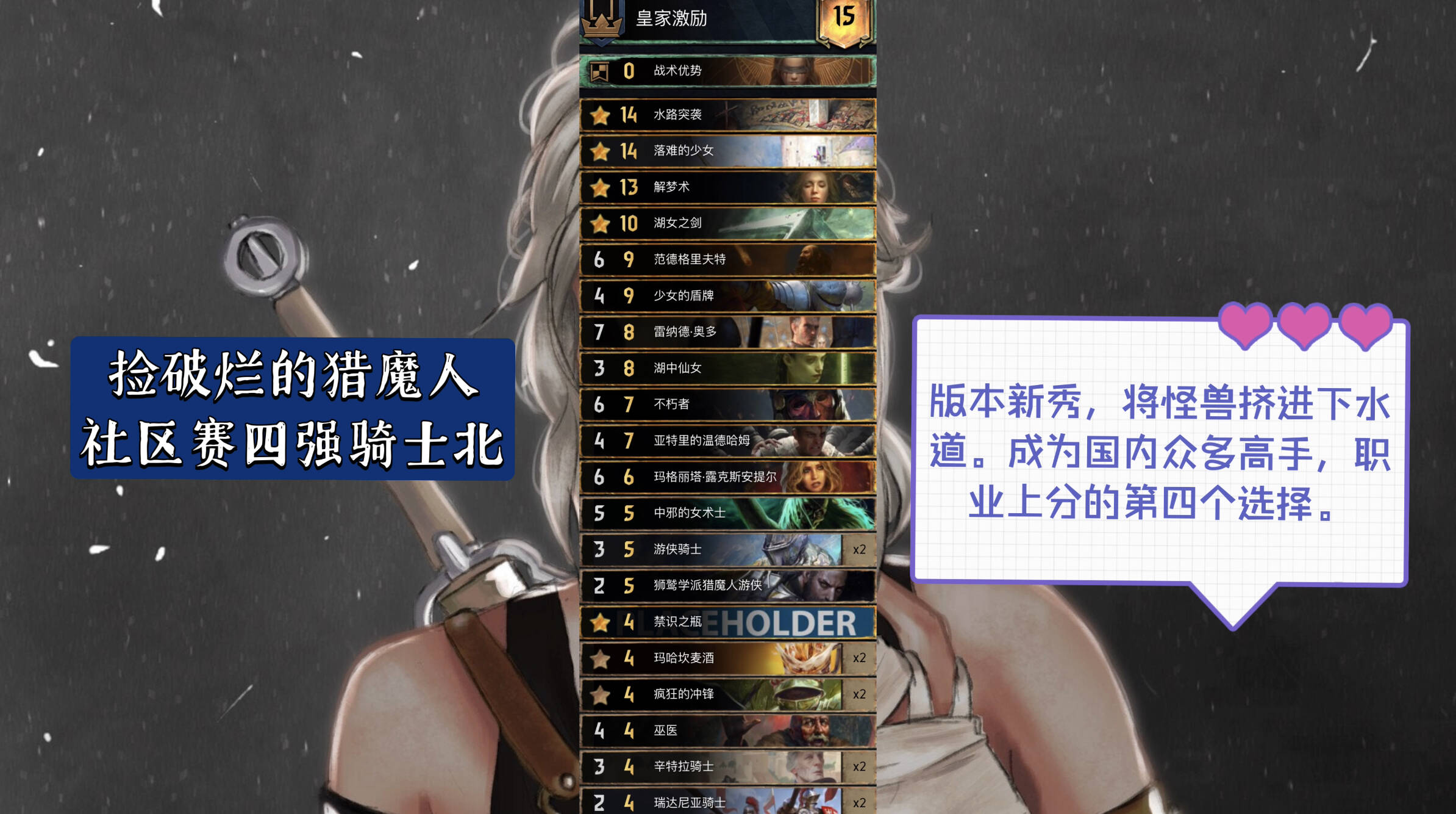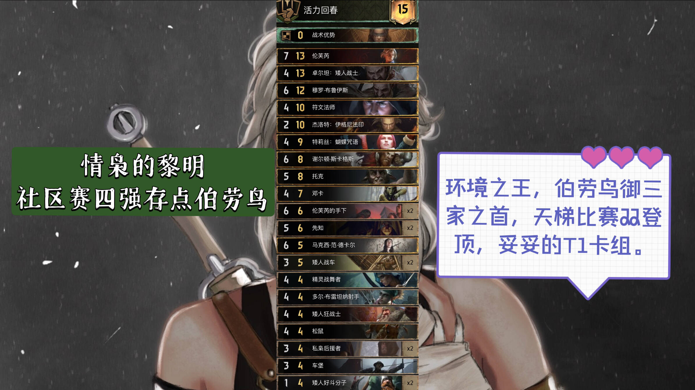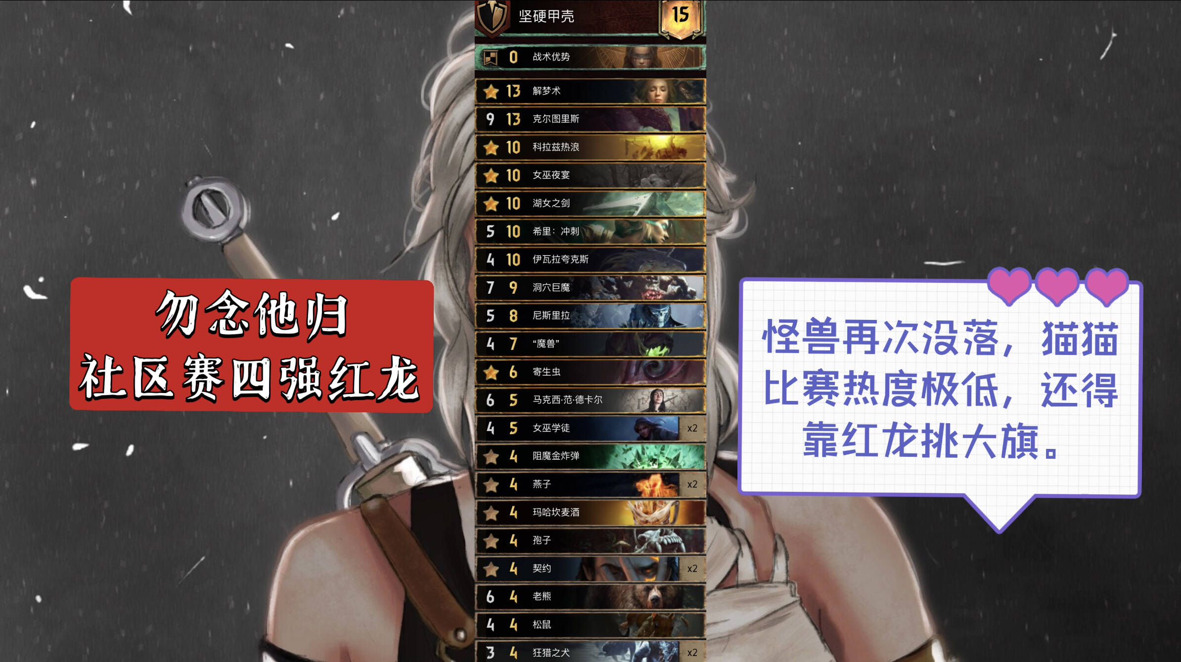 通过昨晚的社区赛,环境已经基本定型:不加入伯劳鸟,就滚出昆特牌!骑士北异军突起,怪兽再次喜提下水道。