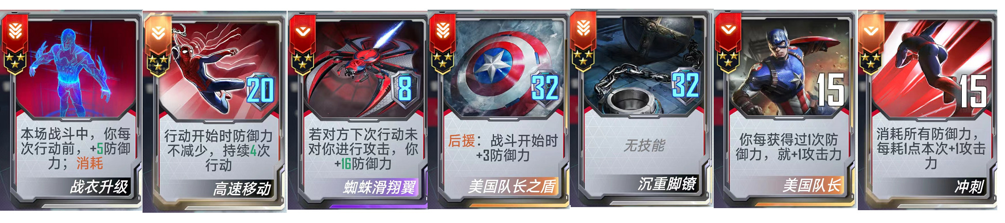 (三)、搭配进阶卡牌:【紧急缩小】、【蜘蛛滑翔翼】、【模仿大师护盾】、【美国队长之盾】、【沉重脚镣】、【美国队长】。