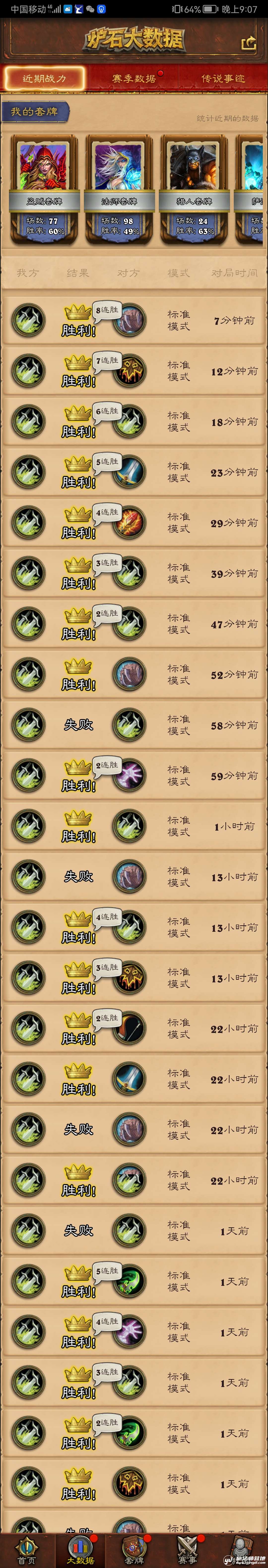 4、猎人,大劣。我能高胜率上传是因为猎人少。胜率第一卡组,咱只能期待他卡手,不然4费费林或者熊,上手总有鱼叉,没啥好打的。