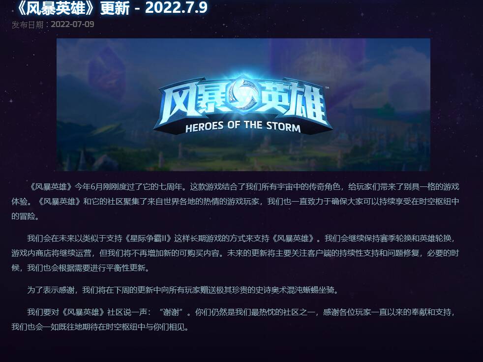 我们会在未来以类似于支持《星际争霸II》这样长期游戏的方式来支持《风暴英雄》。我们会继续保持赛季轮换和英雄轮换,游戏内商店将继续运营,但我们将不再增加新的可购买内容。未来的更新将主要关注客户端的持续性支持和问题修复,必要的时候,我们也会根据需要进行平衡性更新。