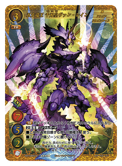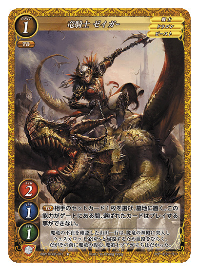 【王者之铠】:通常【DR4/龙】(伤害翻转:将你伤害区的四个龙翻转)将你墓地的一张龙充入这张卡的魂内