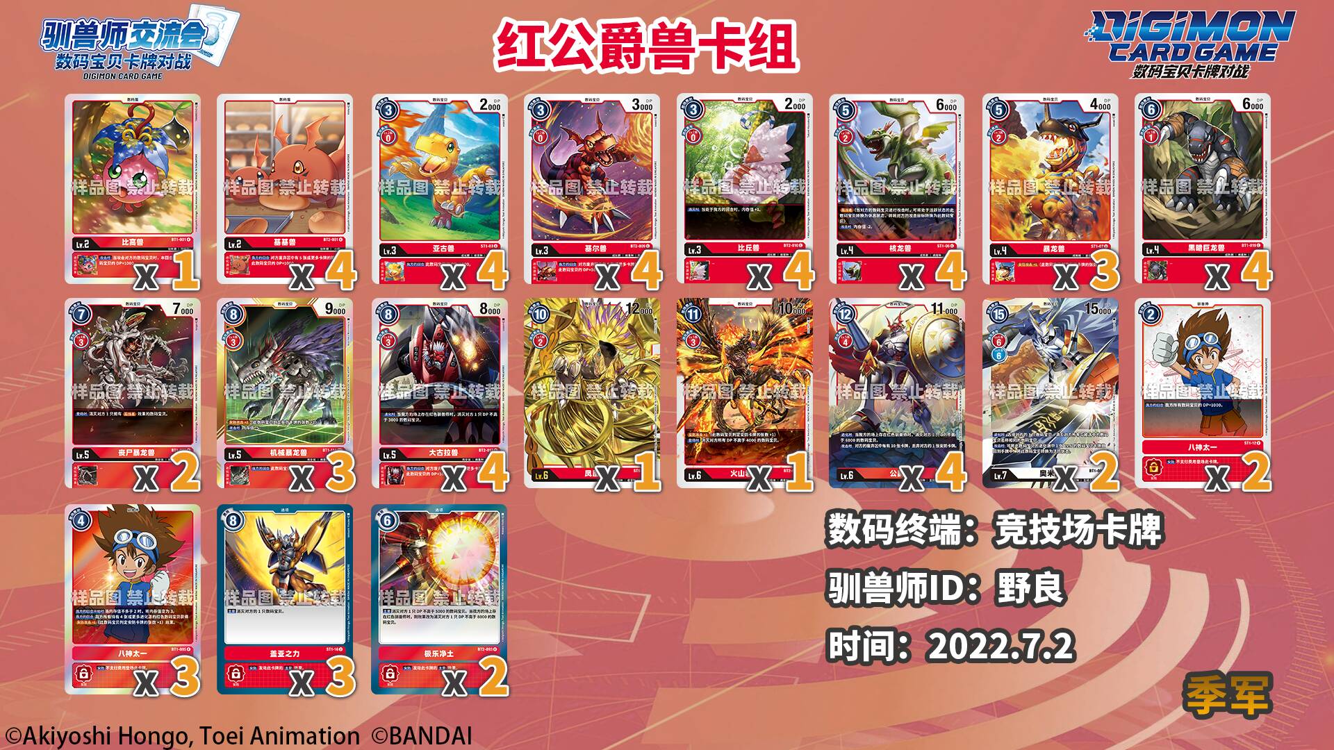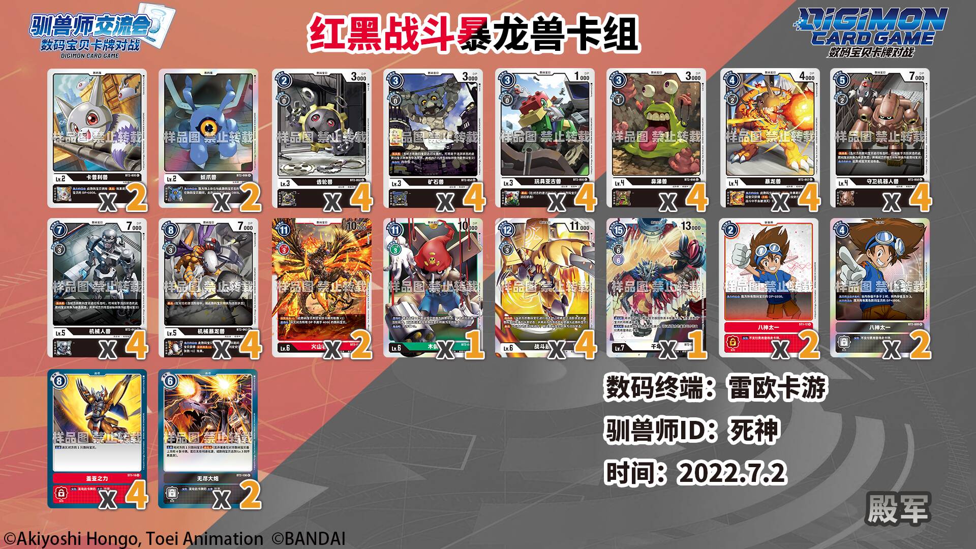 “死神”选手使用红黑战斗暴龙兽卡组在张家口雷欧卡牌7月2日的10人比赛中获得殿军,本次上位卡组类型分布统计中,仅统计到了1套该类型卡组,属于其它板块。