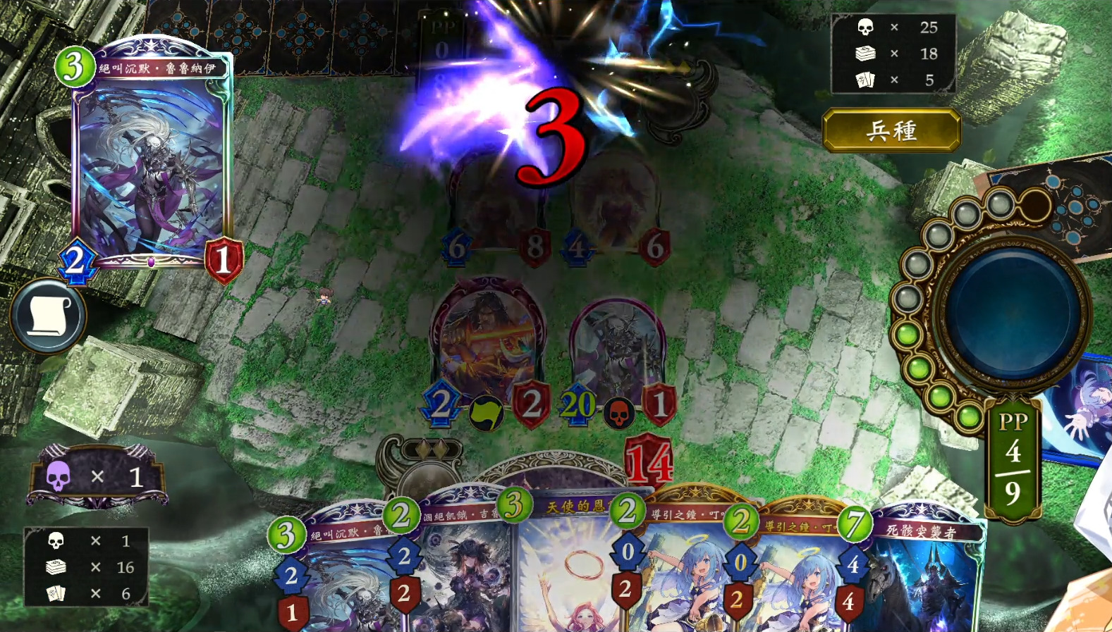 【第3回合】优先使用鲁鲁纳伊解场。无法送掉鲁鲁纳伊的话,也可使用他。先手无事可做的话,可以使用天使的恩宠;后手尽量保留。还可参考第2回合动作。