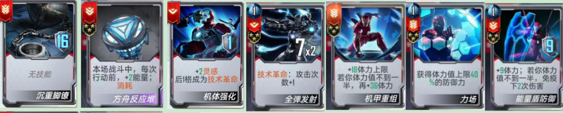 思路是2张技术革命保证输出成长+3张血魔(立场可以换成治愈法典)保证存活,首尾的两张护甲牌也能吃到灵感加成,满级能量盾防御在大额护甲的加持下,免疫两次伤害就成了神技!面对天敌时,可以调整护甲卡的位置,让对面无法命中(1、2、3号位用沉重脚镣/美队盾牌扛,4、5、6号位用立场,7号位免疫盾能展开就稳了)