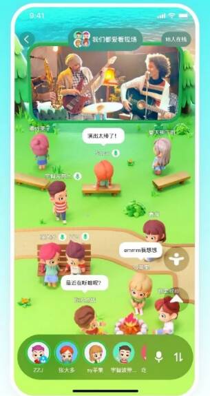 而在活动页面,用户则能够参与聊天、观影等不同的活动,以观影活动为例,手机的上半部分会显示窗口播放视频,下半部分则是公园场景,用户在其中以自己的虚拟形象示人,并能够与其他用户交流互动。