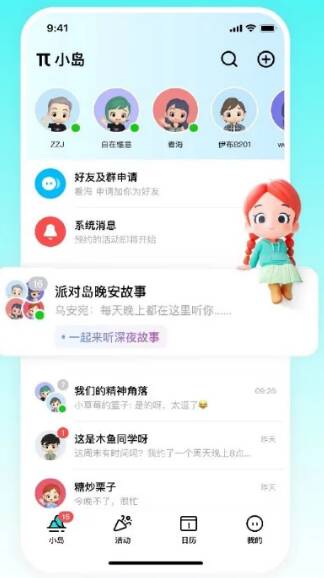 其中,小岛页面中,用户能够看到好友申请、系统消息、联系人在线状态和聊天信息等内容。