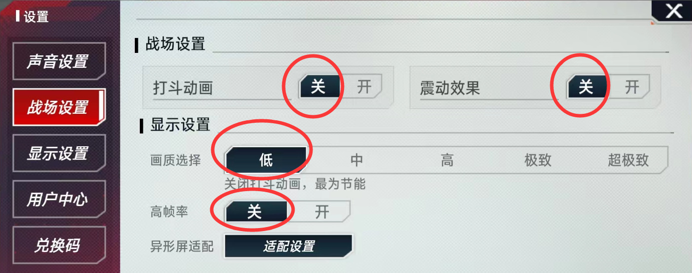(3)、关掉打斗动画、震动效果,画质设置到最低效果。