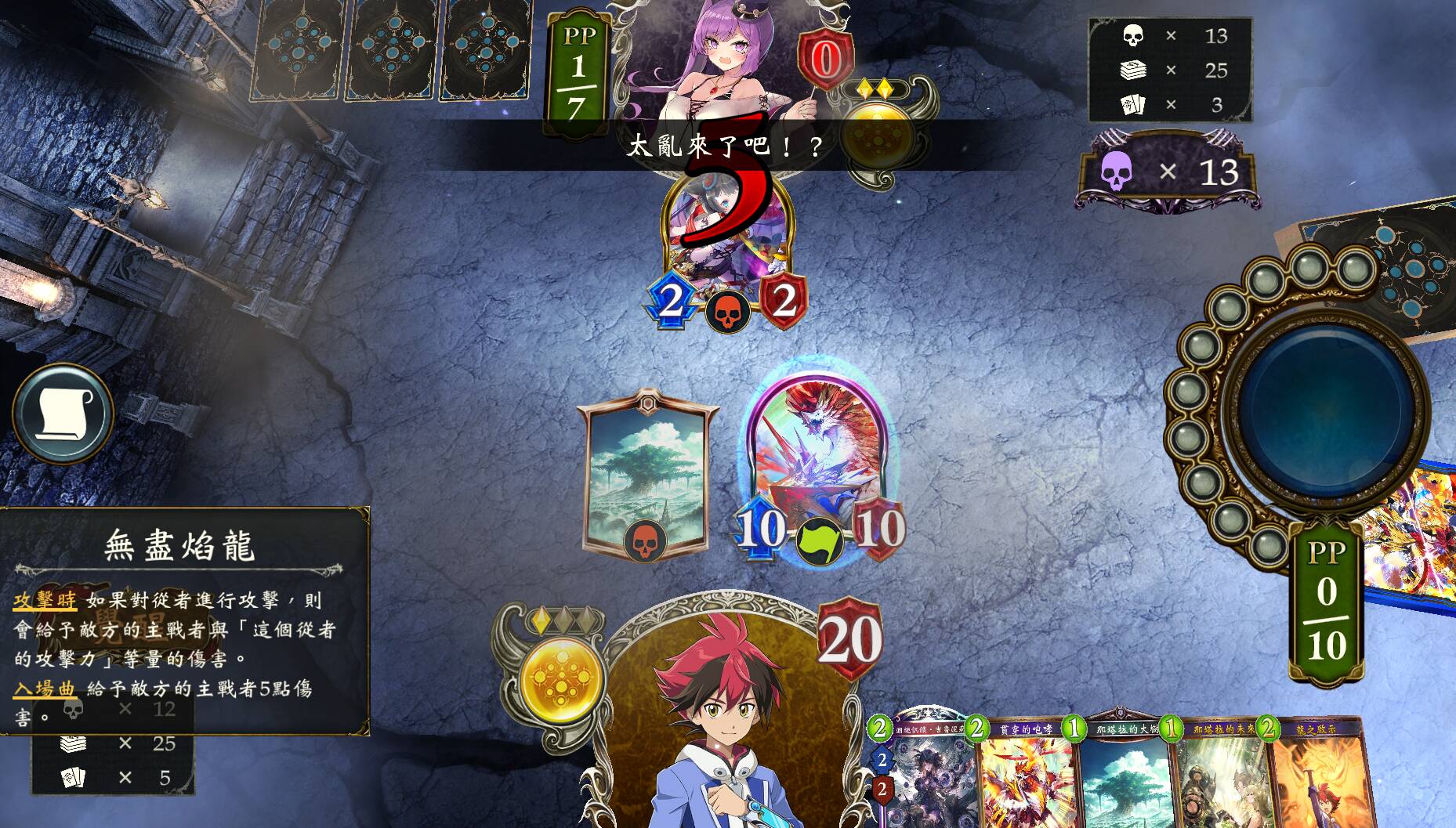 未达6费或没有宝石龙的话,优先跳费,后手可以进化四龙。没有跳费组件的话,优先过牌,也可通过鸣动解场。急需解场的话,可以使用融合了3张牌或效果合适的慈爱,不必贪心进化点。先手实在无事可做的话,可以使用未融合卡牌的慈爱。