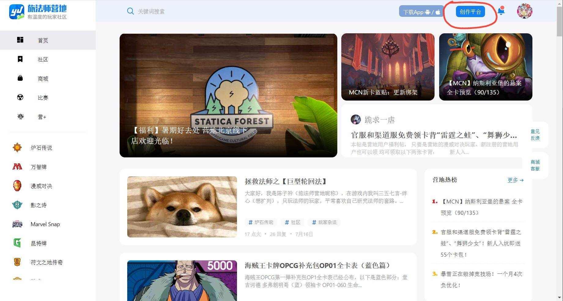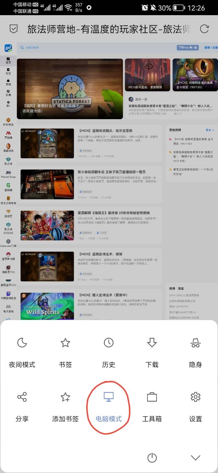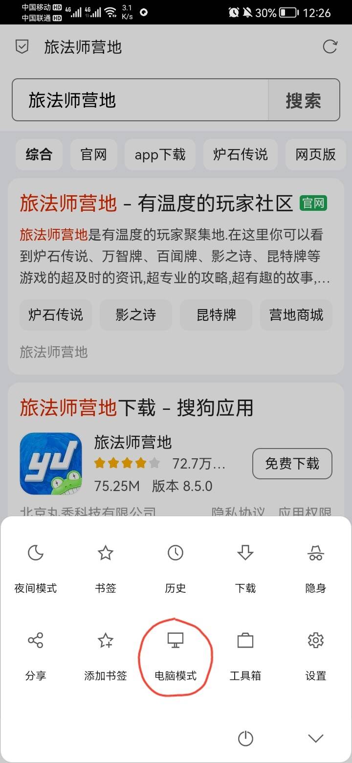 点击“电脑模式”就行了,点击后,你能看到和电脑端一模一样的营地主页,如下图: