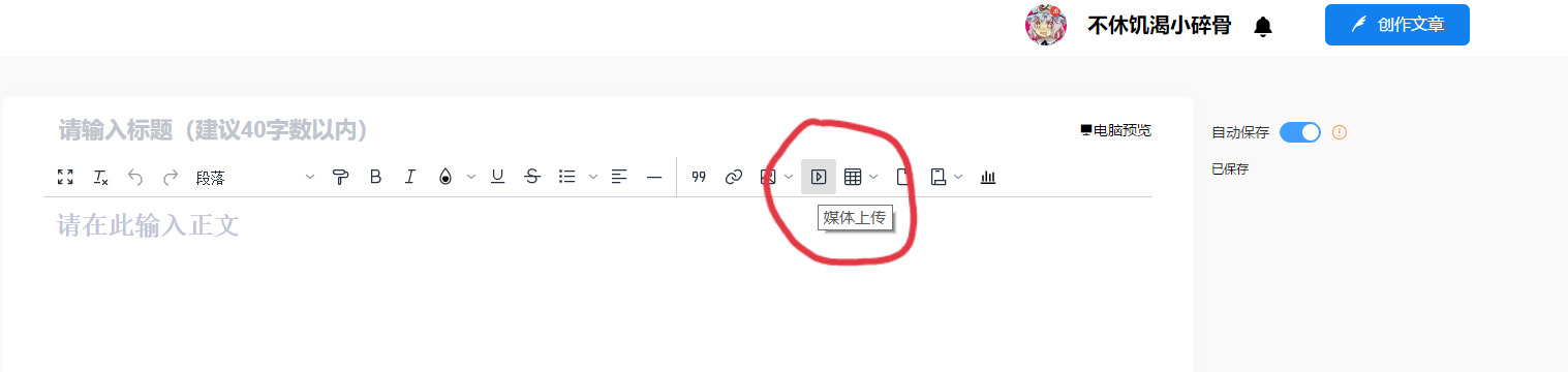 进入创作文章界面后,点击功能菜单中的“媒体上传”。