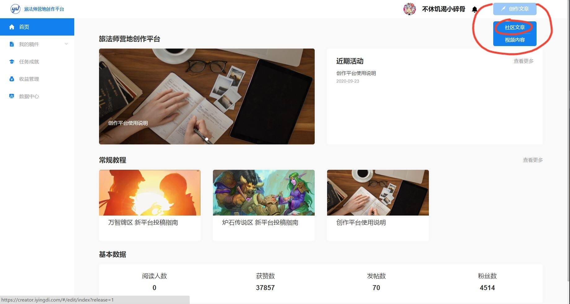 点击“创作平台”,进入新页面,再点击右上角“创作文章”中的“社区文章”如下图: