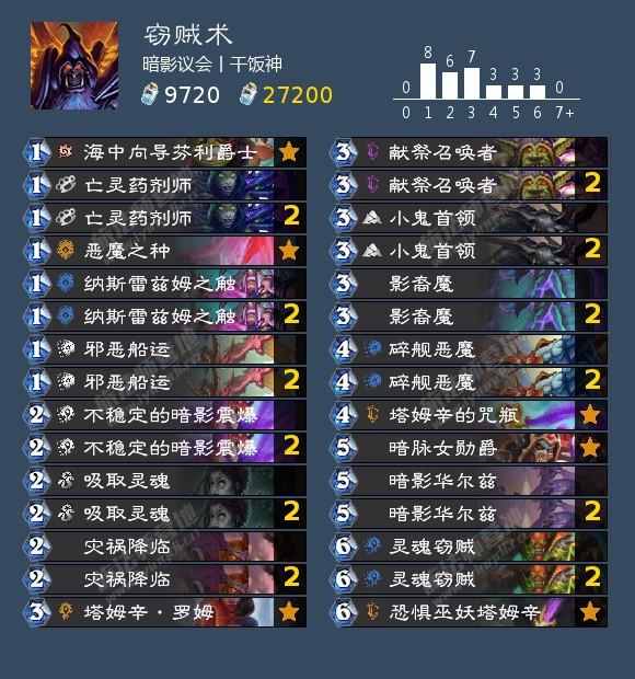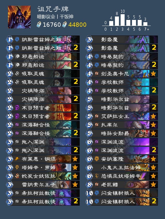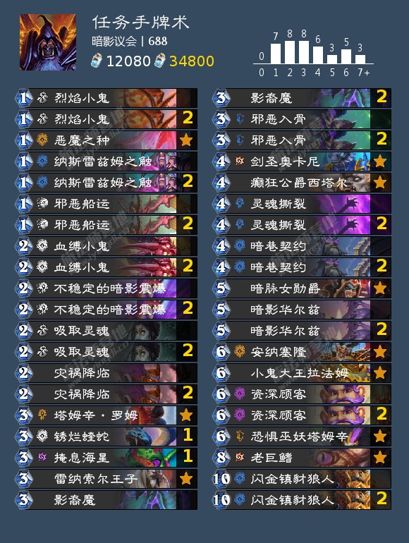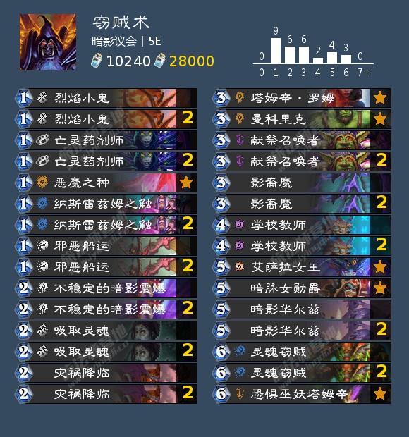 任务和我们一手的血色牌即为赢点,献祭召唤者可以用来点掉暗影华尔兹的5费衍生物及其他5费生物来从牌库中召唤灵魂窃贼(和凯子一样)进行轮转。个人觉得会比凯子术更具强度(废话),且也更加的契合鬼抽轴(灾祸降临及邪恶船运)的运用。上面这套选择带上了娜迦体系和曼科里克,下面这套则去掉这些还有烈焰小鬼换上了碎舰恶魔,塔姆辛的咒瓶和小鬼首领,用碎舰来做任务检索法术配合影裔魔,咒瓶用于回血或做任务(并不能发现暗脉所召唤的怪的亡语)预计强度会很不错。虽然大概还是比不过接下来的体系,但值得各位一试!(总比玩小鬼好吧)