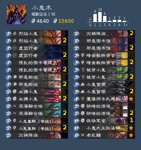 小鬼术的问题很大,相较于上版本的鱼人术,小鬼术在体系内有充足的1费曲线(慌乱的图书管理员,邪恶船运和烈焰小鬼),但2费却略显尴尬,以至于被迫在深海融合怪与小鬼骑士间做出选择。其次,小鬼术没有返场能力,同样是对比鱼人术,甜水鱼人斥候可以让所有鱼人带上突袭,并鳍奇兵在吃到鱼饵桶的buff后可以解站一体,老巨鳍更是有着单方面扭曲虚空的强力效果。反观小鬼术,竟然没有一张牌有着突袭的能力,甚至连“对一个敌方随从造成x点伤害”都做不到,而体系内的牌几乎都需要小鬼站场才能打出上限,因此,被场面压制后的小鬼术基本上就已经是在慢性死亡。 在这套构筑中,选择了深海融合怪弥补2费曲线,因为能够补牌且至少有些梦想。战场军官可以在场面即将崩盘之时尽可能造成更多的伤害,或者在小鬼大王拉法姆铺场之后配合邪恶图书馆斩杀。调皮的小鬼本身强度还有待商榷,在这里选择了放弃调皮的小鬼转而用魔像师卡扎库斯来打出上限,魔像能够做到强力站场(圣盾复制),返场(剧毒打3),续航(抽牌)甚至偷鸡斩杀(潜行复制或者buff),上限显然是比调皮的小鬼要高很多的。