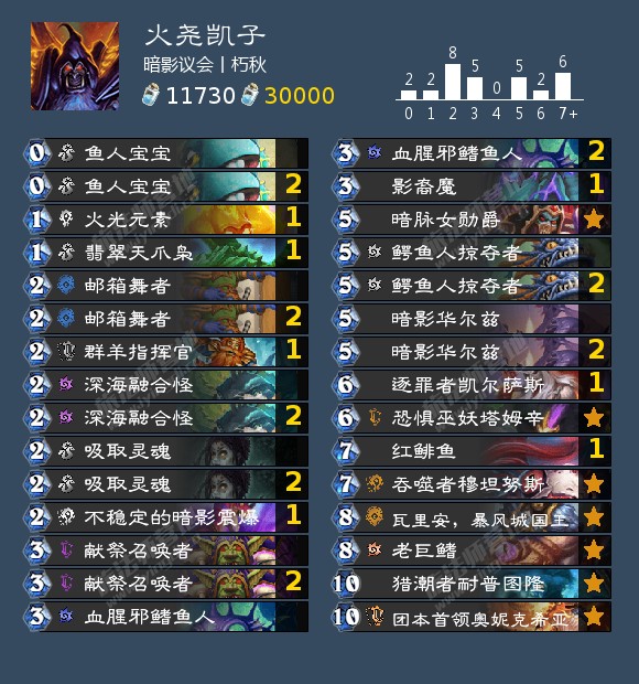 核心单卡便是这张新卡逐罪者凯尔萨斯,献祭召唤者可以用来点掉暗影华尔兹的5费衍生物及其他5费生物来从牌库中召唤凯子。我使用现版本的卡进行了相应的替换找旅店老板(为什么不找黑手)实验了几把,凯子基本都能准时使用,问题是在那之后你要怎么赢?在这之前你又要怎么混?目前还是不太好说。其他可以提的就是带上雷矛元帅之类的牌更好的混日子并提供1费随从投资凯子。