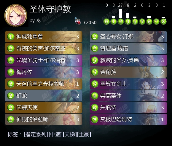 这种构筑方式的优点则有很多。首先,减少中期抽到后容易卡手的护符、结晶,便能获得更好的稳定性。其次,放弃前期出亏节奏的护符后,便能从前期开始铺场,避免被对手站场抢到太多血量,还可以更快堆叠已破坏守护随从数,触发神殿的治愈师、光璨圣骑士·维尔伯特、圣心修女·汀娜的额外效果,进而帮助朱庇特更快触发额外效果。而在快速堆够破坏数和进化数后,守护教还有余裕在第6~7回合拍出崇高圣体,针对土法、双子死等对手的抢血,使自己更容易活到爆能圣辉。此外,不再投入非常需要进化点的天马之后,梅丹佐和神威独角兽更容易享受进化点,赚取价值。