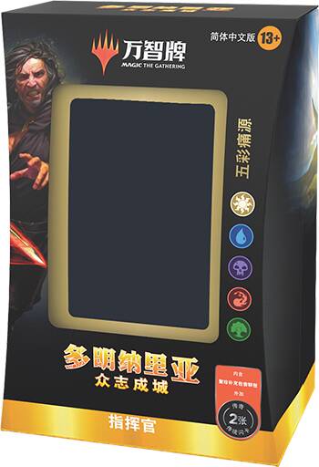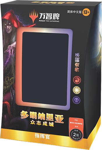 多明纳里亚:众志成城指挥官套牌内含100张牌,打开即可对战,每副套牌内含两张闪卡以及多张全新的万智牌牌张用来扩充你的收藏。另外,每副指挥官套牌内含一包聚珍补充包尝鲜包:内含两张牌,让你感受一下多明纳里亚:众志成城聚珍补充包的内容,其中一张拥有彩窗玻璃处理,另一张是该系列的稀有或秘稀牌(传统闪或不闪)。