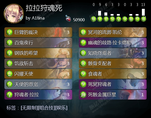 这套牌是围绕死冥狩魂者运作的特殊组合技,主要通过她的入场曲制造对手无法处理的巨大场面取胜。