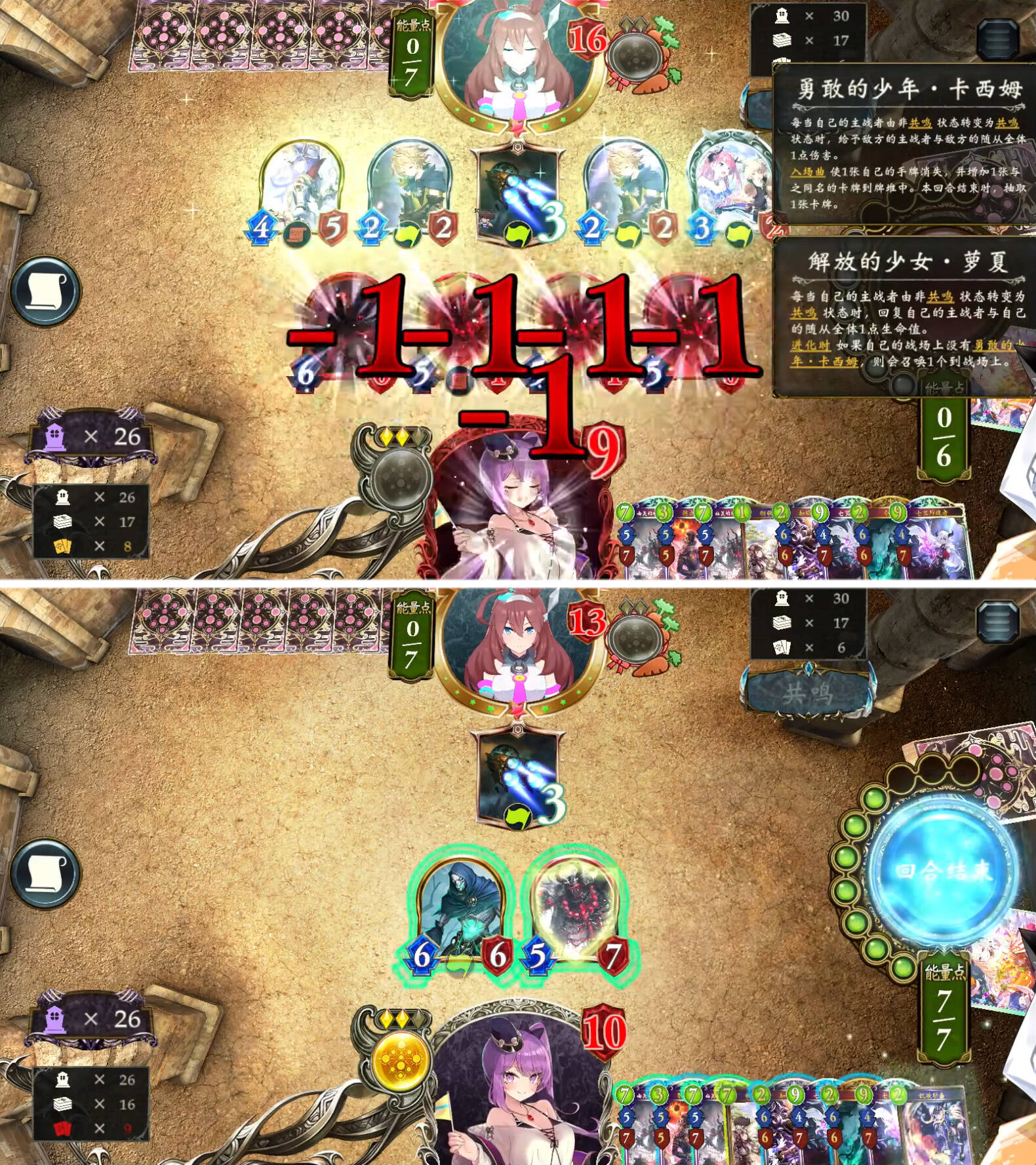 【第4回合】过牌凑齐组合技组件,并留意复活池。组件已齐的话,保留1费葬送牌,用于在下回合配合狩魂者和拉拉。