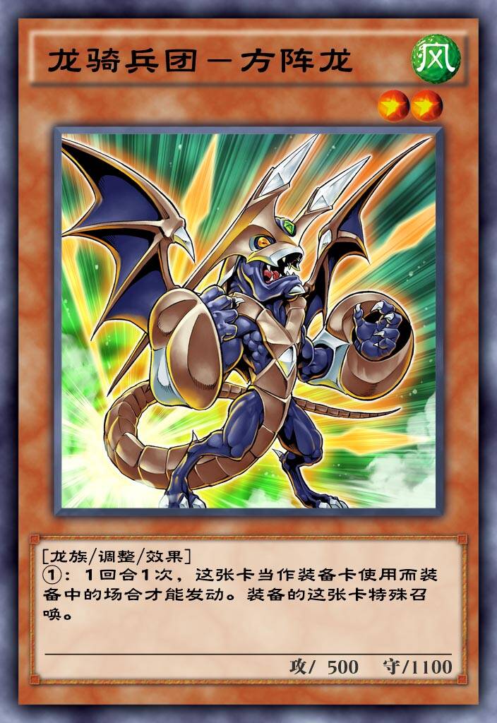 方阵龙1回合1次,这张卡当作装备卡使用而装备中的场合才能发动。装备的这张卡特殊召唤。 配合元老院和指挥官可以直接进行展开.