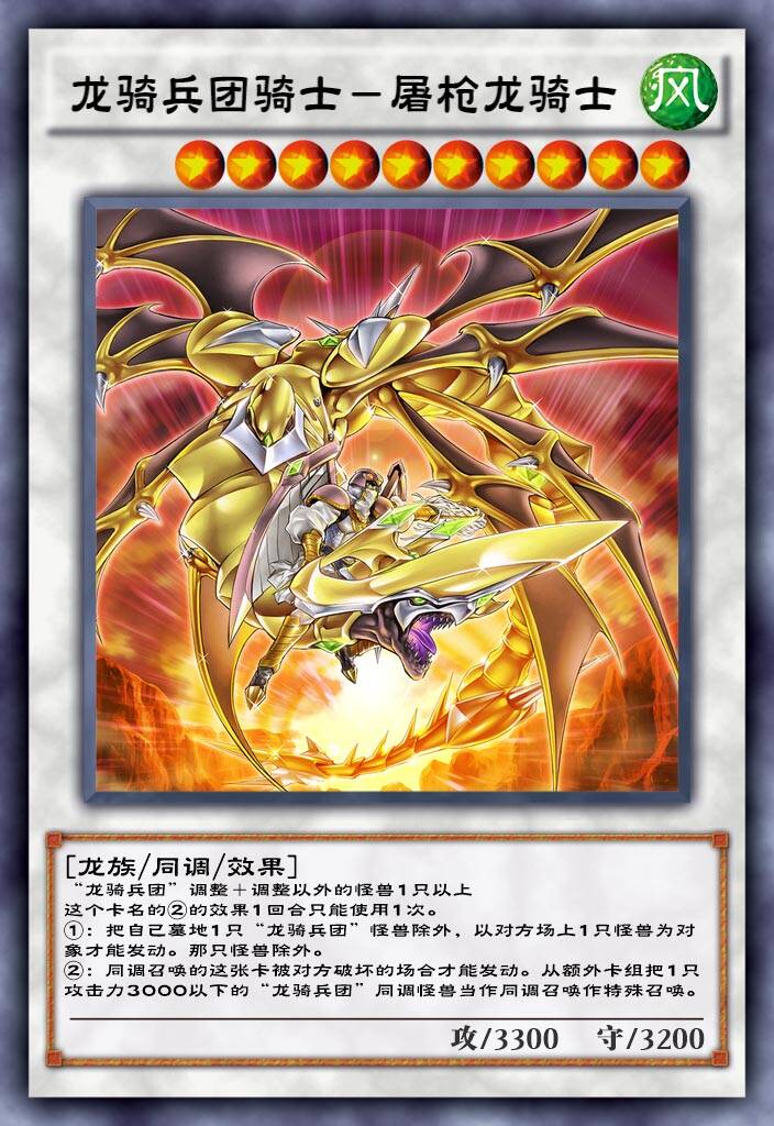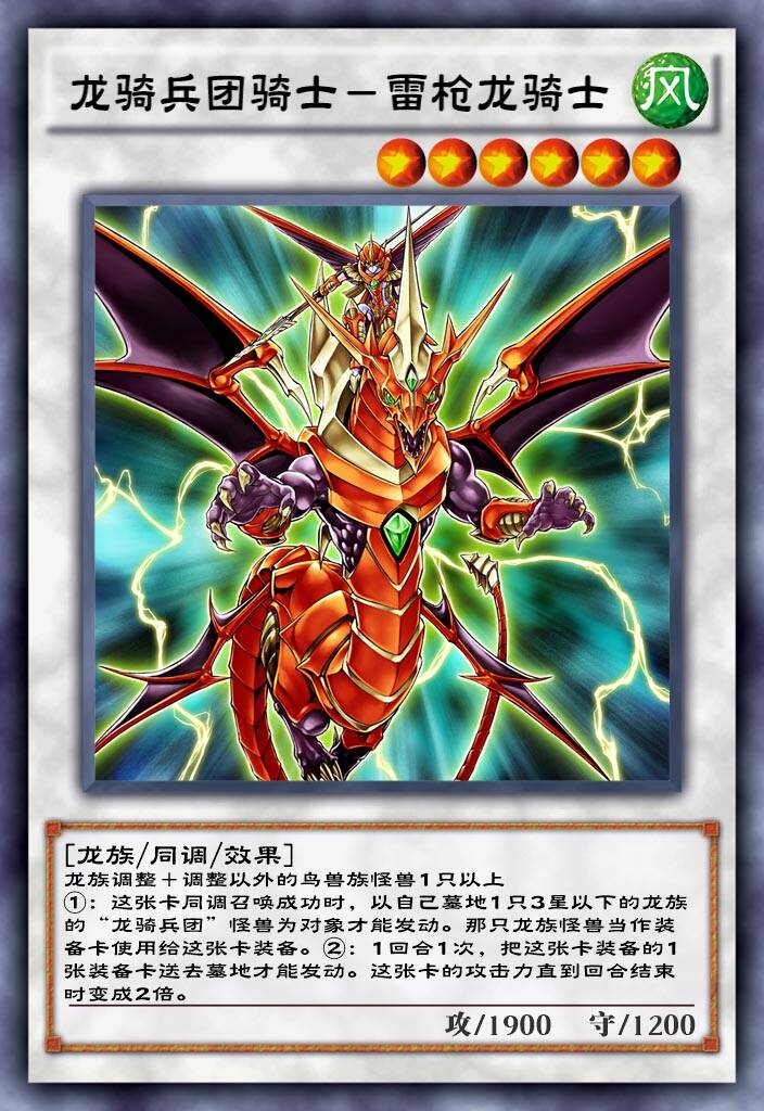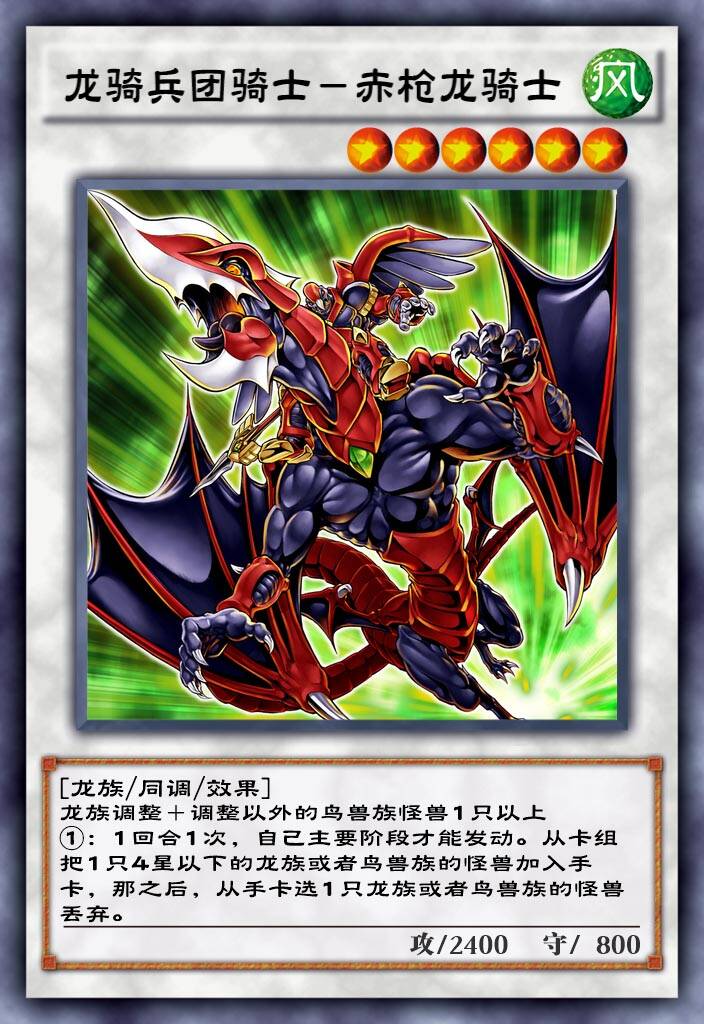 龙骑兵团本家大哥,效果1回合,把自己墓地1只“龙骑兵团”怪兽除外,以对方场上1只怪兽为对象才能发动,那只怪兽除外。同步召唤的此卡倘若被对方破坏,还能从额外卡组把1只攻击力3000以下的“龙骑兵团”同步怪兽特殊召唤.由于此次国服并没有放出本家4星怪关刀龙,所以现在做出本家大哥的难度还是有点高.