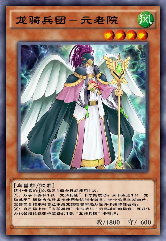 元老院可以从手卡丢弃1张「龙骑兵团」卡才能发动。从卡组选1只「龙骑兵团」协调当作装备卡使用给这张卡装备。目前本家核心初动卡,可以卡组装备 方阵龙进行展开,二卡出10星大哥.