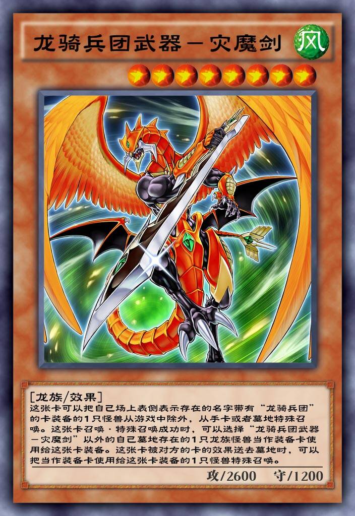 灾魔剑这张卡可以把自己场上表侧表示存在的名字带有「龙骑兵团」的卡所装备给的1只怪兽从游戏中除外,从手卡或者墓地特殊召唤。这张卡召唤·特殊召唤成功时,可以选择「龙骑兵团武器-灾魔剑」以外的自己墓地存在的1只龙族怪兽当作装备卡使用给这张卡装备。这张卡被对方的卡的效果送去墓地时,可以把当作装备卡使用给这张卡装备的1只怪兽特殊召唤。 需要将自己场上表侧表示存在的名字带有「龙骑兵团」的卡所装备给的1只怪兽从游戏中除外特召,出场比较困难,主流龙骑兵团构筑不会下这张卡,想娱乐可以考虑带.
